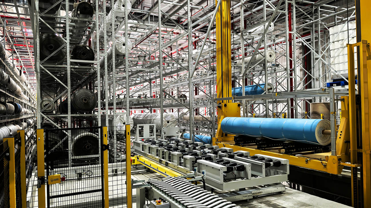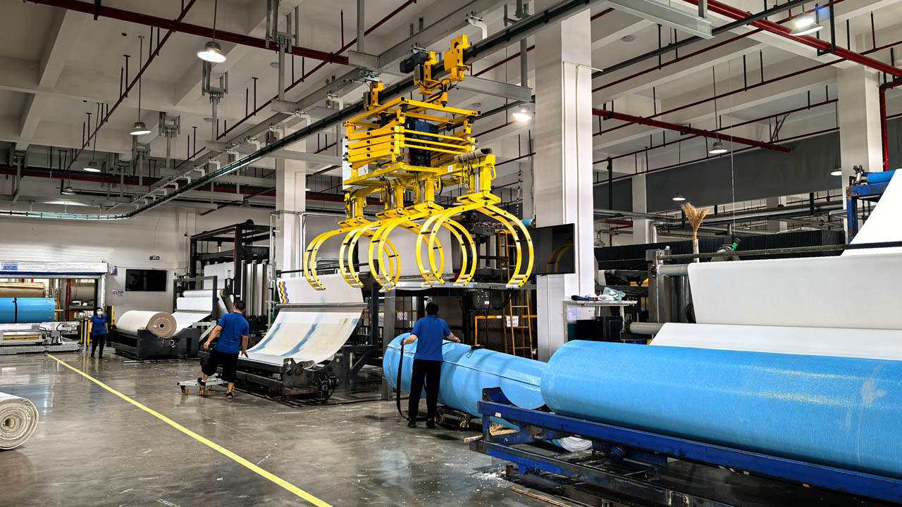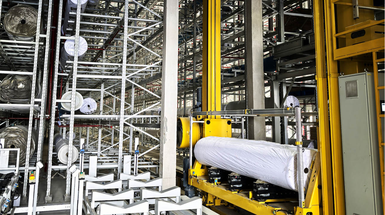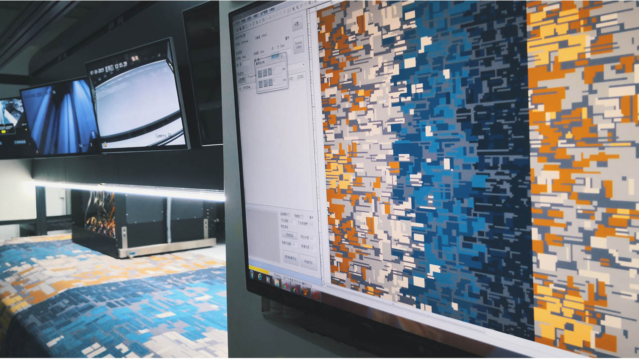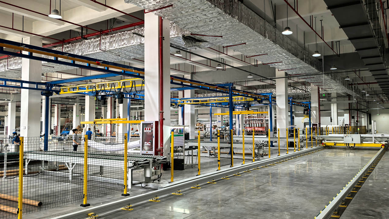 鸿成为国内首家立库与产线深度结合的地毯制造商,通过现场WCS,WMS,与我们自主研发的生产控制软件,我们实现了95%的产线物料进与出相关的自动化,包括簇绒,印花,方块地毯的自动上下料,下机检验的自动输送线,KBK支架等。